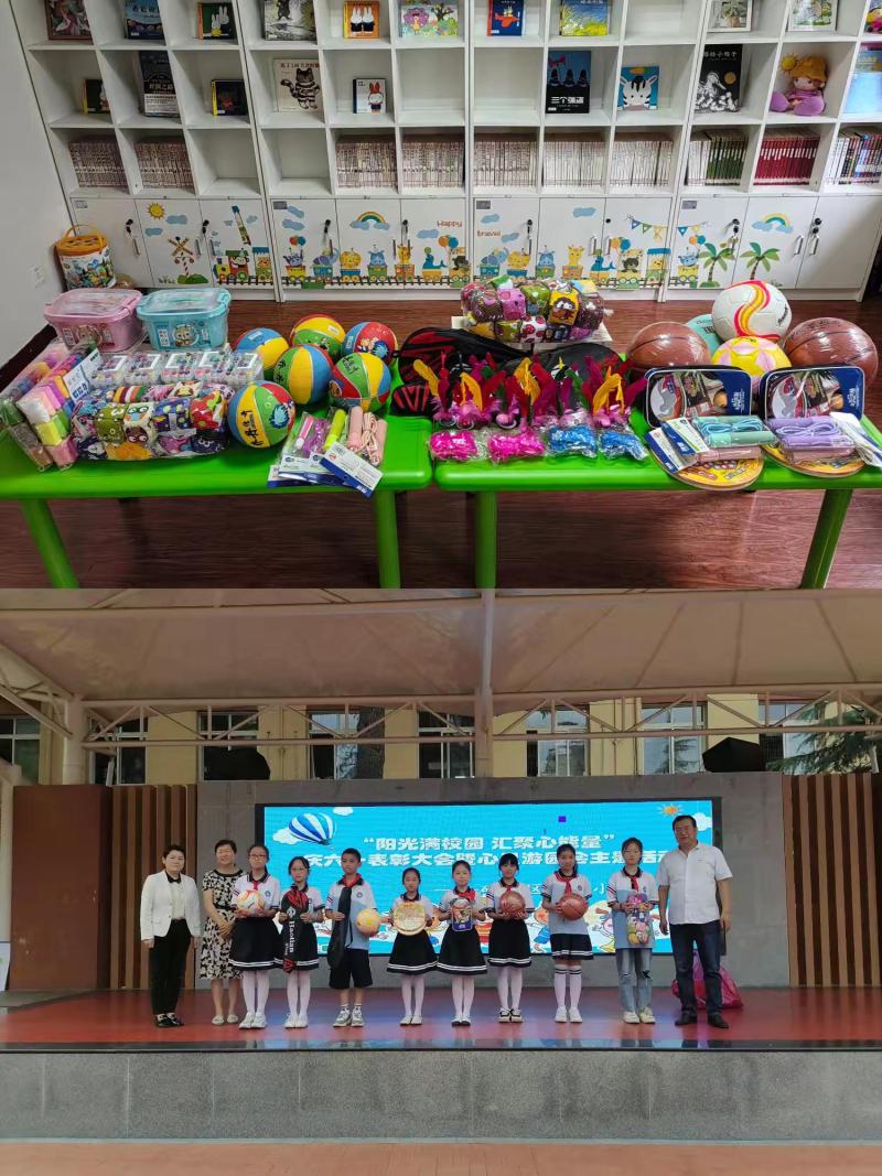 在“阳光满校园,汇聚心能量”庆“六·一”表彰大会暨心理游园会主题活动的赠送仪式上,长乐坊街道办事处党办主任陈飞燕及兴庆社区书记姚亚梅为兴庆小学的师生们赠送了准备已久的精美小礼物,其中包括给高年级的孩子用的体育用品:足球、篮球、羽毛球、沙包、毽子、跳绳等。并且寄予他们在热爱学习的同时,积极参加体育活动,健康成长,养成强壮的体魄。对此在场的师生们都心有所触,欣然领会,大家都兴奋不已,迫不及待的想去感受新礼物带来的喜悦。
