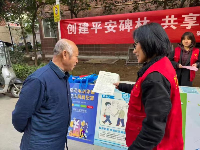 一群热情的志愿者向过往居民递发宣传袋,袋子里精心准备了安全知识手册和防范指南。志愿者们耐心细致地为居民讲解宣传内容,尤其对老年人群体给予了重点关注。他们用通俗易懂的语言,提醒老人们注意防范电信诈骗,保护好个人财产安全,让老人们听得明白、记得清楚。