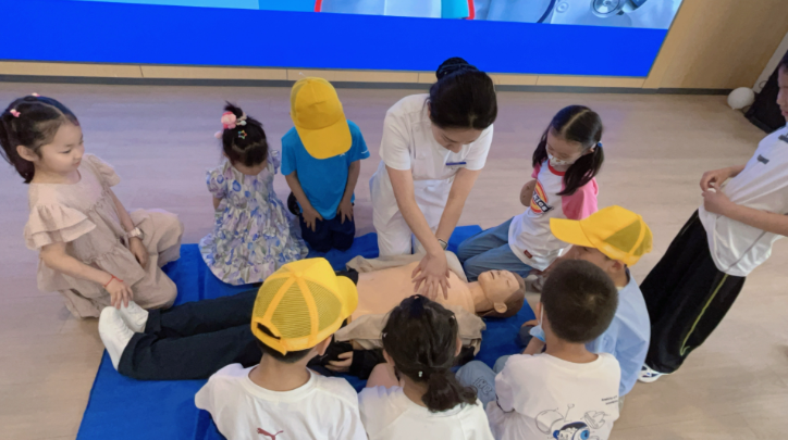 急救知识学习无疑是活动的重要环节。在室内教育场所,医护人员通过现场示范和耐心指导,带领孩子们学习基础急救技能。孩子们迅速围在垫子周围,目不转睛地观察着医护人员的每一个动作,并积极参与实践。现场气氛热烈,充满了浓厚的学习热情。