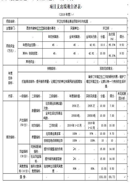 环卫垃圾清运评价与检查项目绩效自评综述:根据年初设定的绩效目标,项目自评得分89.73分。项目全年预算数45万元,执行数42.92万元,完成预算的95.37%。主要产出和效果:确保了环境卫生工作的顺利开展,维护了辖区内环境卫生,让群众有了一个良好的生活环境。