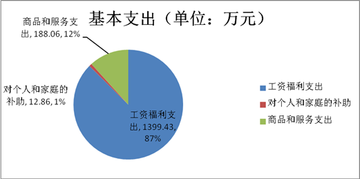 2019年一般公共预算财政拨款基本支出1599.9万元,包括:人员经费支出1399.43万元和公用经费支出187.61万元。较上2.25万元,本年增加原因是人员经费增加。