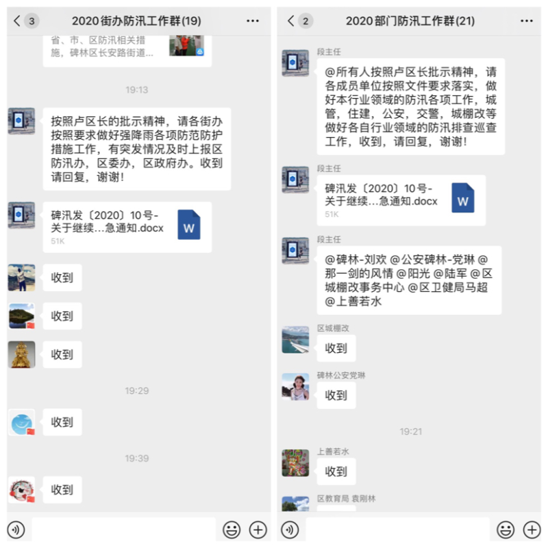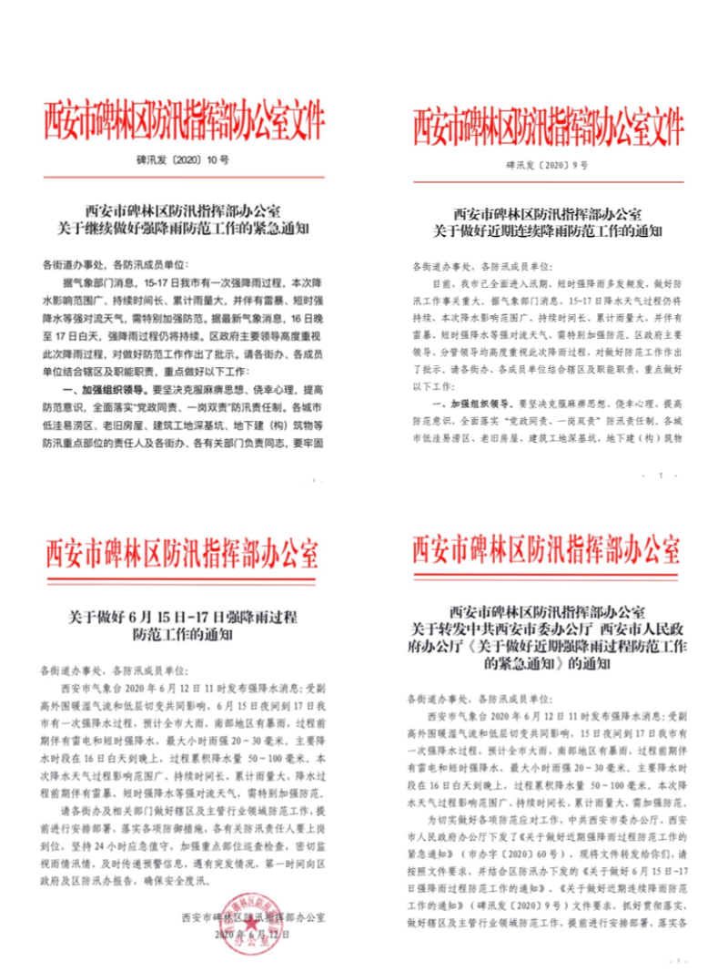 6月16日,降雨过程仍在持续,碑林区防汛办始终保持高度警惕,毫不松懈,按照区政府主要领导的批示精神以及区应急管理局主要领导的指示,连续发送预警信息,要求加强巡查检查,做好防范工作。各街办收到预警后,均能第一时间响应,积极上路开展巡查检查。