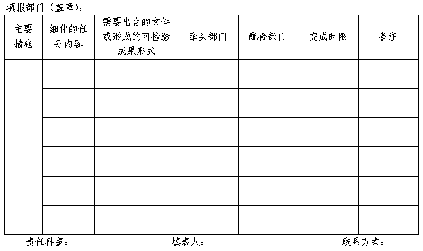 9项主要措施中涉及的重点工作任务,由第一牵头部门负责、其他牵头部门配合,按附表样式建立工作任务台账,并于11月13日前报送至区审改办(区编办)备案。