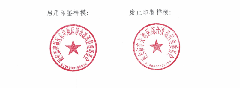 根据区政府办公室《关于印发西安市碑林区东关地区综合改造管理委员会主要职责内设机构和人员编制规定的通知》(碑政办发〔2018〕23号),设立“西安市碑林区东关地区综合改造管理委员会”。为便于开展工作,自文件下发之日起正式启用“西安市碑林区东关地区综合改造管理委员会”印鉴。同时,废止“西安市东关地区综合改造管理委员会”印鉴。原以“西安市东关地区综合改造管理委员会”印鉴办理的项目手续,签订的合同、协议等所有文件材料,后续办理执行时,使用“西安市碑林区东关地区综合改造管理委员会”印鉴。