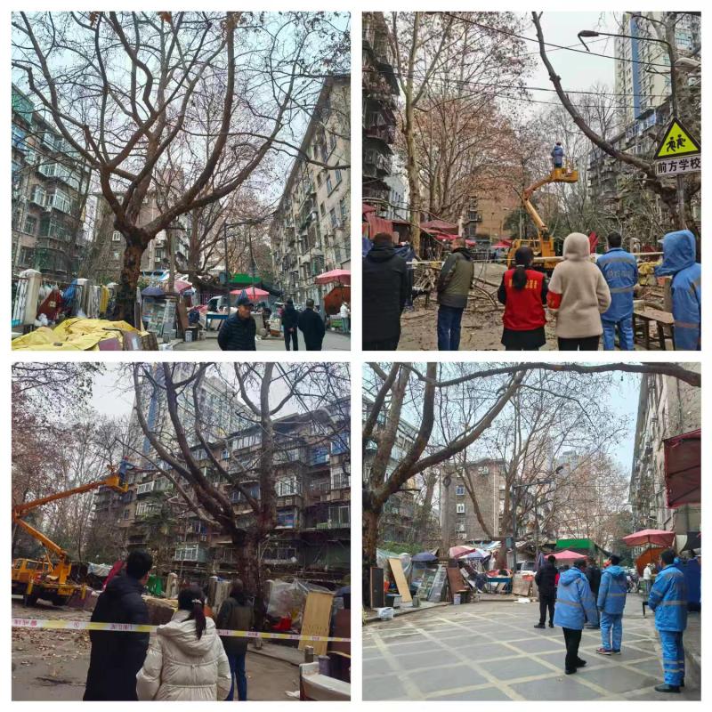 在街道统筹下,社区联合碑林区城管绿化队,形成“社区吹哨、部门报到、多方协同”工作模式。提前发布绕行通知,走访商户争取支持,现场拉设警戒线、专人疏导,在保障安全与正常经营的前提下,有序完成枯树清理,全程规范高效。