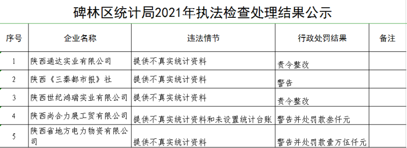 碑林区统计局2021年执法检查处理结果公示