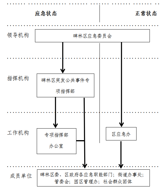 碑林区成立应急委员会(以下简称区应急委),为领导全区突发事件应对工作的领导机构。区应急委由主任、副主任及委员构成。主任由区长担任;副主任由区委副书记、纪委书记和常务副区长担任;委员一般由区委、区政府相关领导和区委、区政府有关部门负责同志担任。区应急委具体的人员构成由区委、区政府根据实际情况研究决定,区应急委组成人员的通知文件以区委、区政府名义印发公布。区应急委的组成人员名单详见附件1。