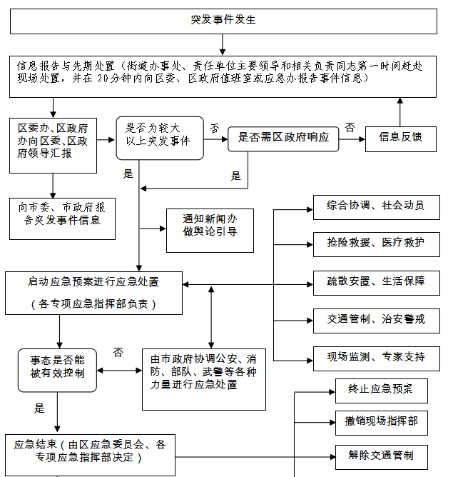 当确认突发公共事件即将或已经发生时,事发地的街道办事处和区级有关部门立即做出响应,按照“统一指挥、联合行动、专业处置”的要求,成立由各部门负责领导参加的专项指挥部,确定联系人和通信方式,指挥协调公安、交警、消防、卫生等部门应急队伍先期开展救援行动,组织、动员和帮助群众开展防灾、减灾和救援工作。