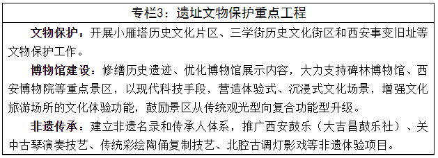全面加强文物保护单位、历史文化街区、名人故居、历史建筑、革命文物等文化遗产的科学保护和合理利用。加大文物保护利用力度,加强文物预防性保护和本体周边环境治理,守护好世界文化遗产,加快推进碑林博物馆新馆建设和西安博物院等改造提升,打造城市文化地标。积极推动文化遗址及文保单位向博物馆职能转型,加大对博物馆的扶持力度。加强革命文物保护传承,确保革命文物的历史真实性、风貌完整性和文化延续性。实施传统工艺美术振兴计划,加强非物质文化遗产名录和传承体系建设,努力将文物保护利用成果更多更好惠及人民群众。