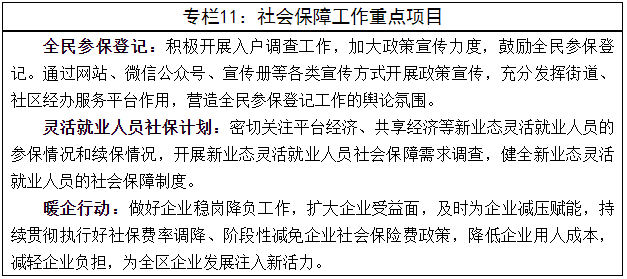 全面实施全民参保计划。健全覆盖全民、公平统一、可持续的多层次社会保障体系。促进城镇居民养老保险适龄参保人员应保尽保,完善机关事业单位养老保险制度,强化基本医疗保险、大病保险与医疗救助三重保障功能,完善失业、工伤保险制度,推动医疗保险与商业保险互补发展,探索落实异地就医结算,逐步实现社会保障“一卡通”。落实社会保险转移衔接政策,做好跨地区流动就业人员社会保险关系转移和权益保障。落实社会保障待遇水平调整政策,适时调整养老保险待遇水平。